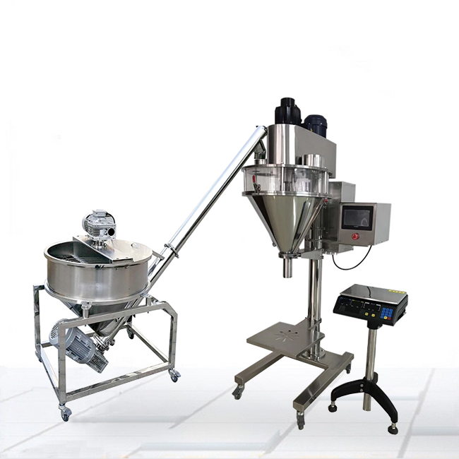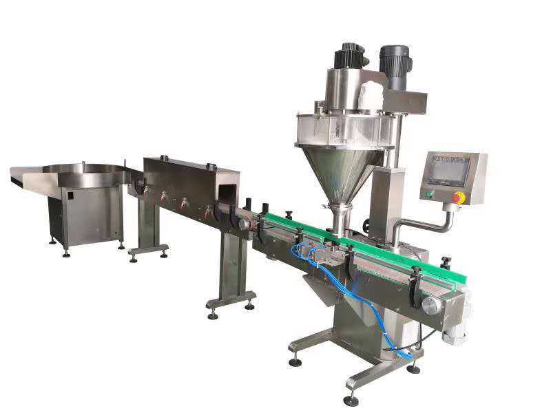1.全自動粉末瓶裝灌裝生產線:理瓶機 →自動上料機 →單頭粉末灌裝機 →旋蓋機(或封罐機)→瓶口鋁箔封口機 →貼標機 →噴碼機 →鏈板輸送帶 →裝箱平臺,可以根據產品的要求選擇流水線配置